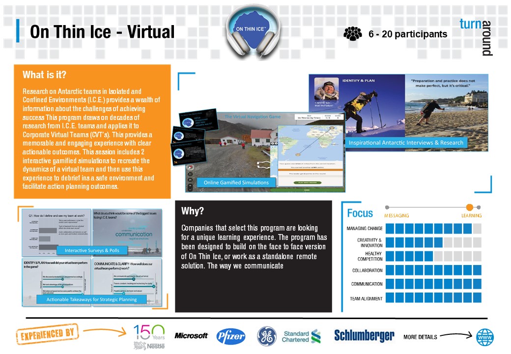 Research on Antarctic teams in Isolated and Confined Environments (I.C.E.) provides a wealth of information about the challenges of achieving success This program draws on decades of research from I.C.E. teams and applies it to Corporate Virtual Teams (CVT’s). This provides a memorable and engaging experience with clear actionable outcomes. This session includes 2 interactive gamified simulations to recreate the dynamics of a virtual team and then use this experience to debrief ins a safe environment and facilitate action planning outcomes.